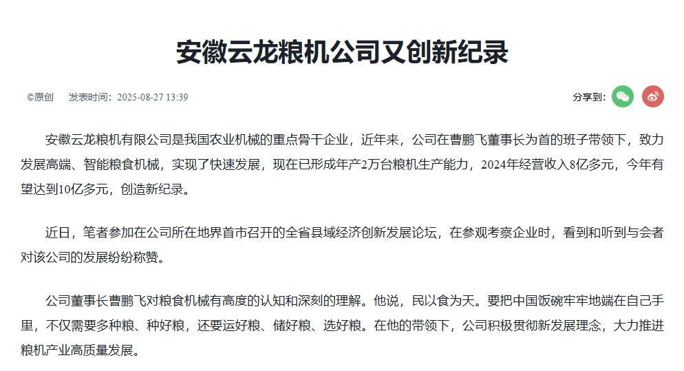 中國(guó)工業(yè)新聞網(wǎng):安徽云龍糧機(jī)公司又創(chuàng)新紀(jì)錄